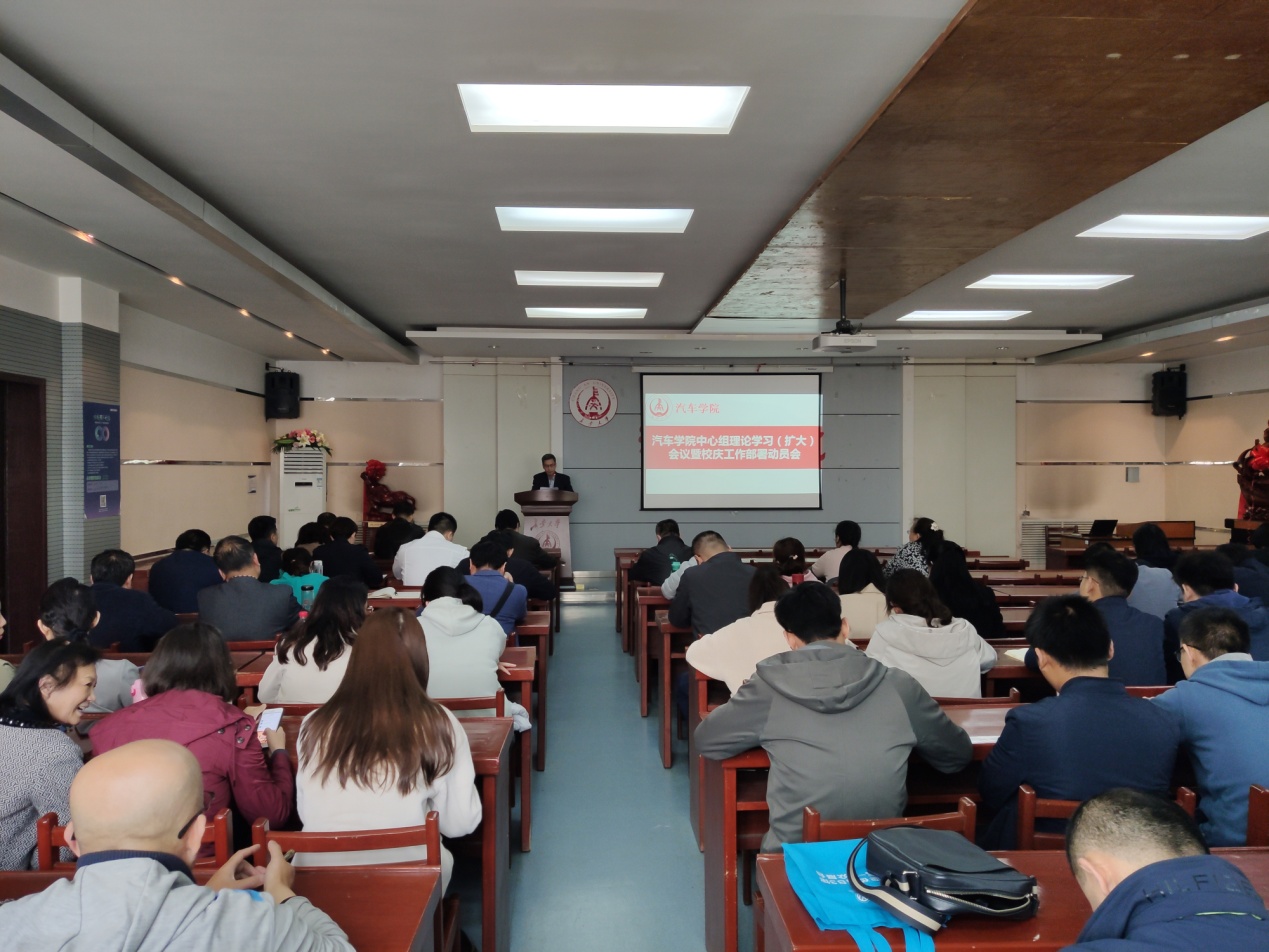 秦希军书记首先向全体教职工传达了4月10日学校校庆动员大会的会议精神,并从学院校庆工作主题、宣传、筹备、校友邀请和会议安排等几个方面对近期的工作向全体教职工做以说明安排,他讲到校庆时学院近期最重要的工作,希望学院全体职工齐心协力,积极参与,共同用主人翁的心态共同办好这次盛会。
