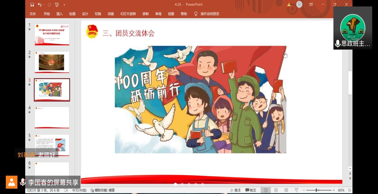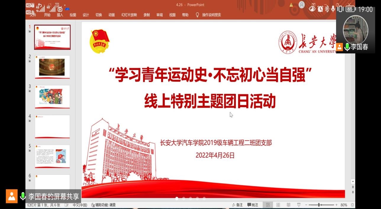 2019级车辆工程二班团支部通过腾讯会议举行了“学习青年运动史•不忘初心当自强”线上特别主题团日活动。活动由支部书记李国春主持,支部全体成员参与,思政班主任侯贻栋老师全程参与指导。