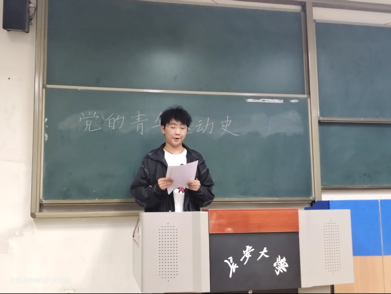 首先,黄垣硕带领同学们共同学习了自中国共产党成立以来的青年运动史,让同学们进一步了解了艰难岁月中广大青年的英勇担当,意识到当今时代吾辈青年的光荣使命。随后,支部成员一同观看视频《奋斗吧,青年!》,为新时代青年不惧艰苦,迎难而上的精神所感染,纷纷上台谈感受,讲体会,表示要不忘初心、砥砺前行,争做新时代的接棒人。