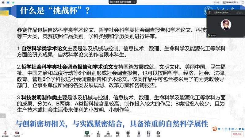 首先,贾明格同学对挑战杯赛事进行了基本介绍,讲述了挑战杯举办意义、作品分类、参赛要求以及课赛竞赛流程等内容。