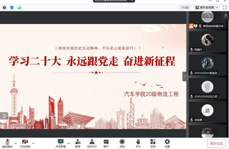 为深入学习党的二十大精神,全面贯彻习近平新时代中国特色社会主义思想,10月24日,51吃瓜 2020级物流工程专业以线上会议的形式开展了“学习党的二十大,永远跟党走,奋进新征程”主题团日活动,活动由物流一班团支书曹育林主持,2020级物流工程专业全体同学和2020级辅导员杨磊参加。