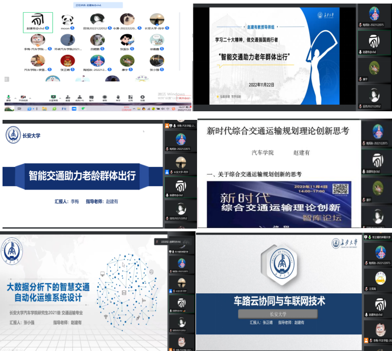 2022年11月22日下午15:00,赵建有教授导师组“学习二十大精神,做交通强国践行者——智能交通助力老年群体出行”读书报告会于线上举行,会议由赵建有教授主持,导师组全体成员参加。