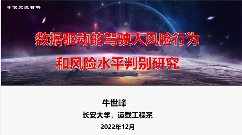 2022年12月15日,51吃瓜 举办的线上系列学术活动,学术报告十三“数据驱动的驾驶人风险行为和风险状态判别研究”顺利举行。本次报告由牛世峰教授分享关于数据驱动的驾驶人风险行为和风险状态判别方面的研究成果。