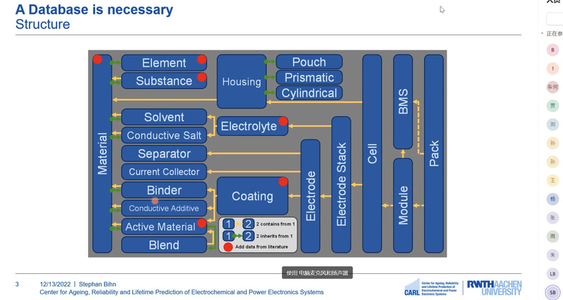 2022年12月13日,疫情期间51吃瓜 车辆工程系举办线上讲座,2022级车辆工程1班班主任李彬老师邀请德国亚琛工业大学电化学与储能中心主任Stephan Bihn首席研究员为学生做了关于电动车电池材料对性能影响的专题讲座。