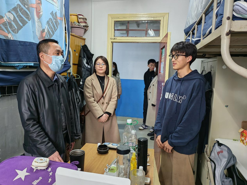 在走访过程中,各位领导老师与同学们亲切交谈,详细询问了大家近期的课程与考试情况,勉励同学们要认真复习备考,务必诚信考试。对于同学们热切关注的宿舍搬迁、改造问题,各位领导老师认真了解同学们的实际情况与困难需求,叮嘱大家在搬迁、改造过程中要树立安全意识,杜绝安全隐患,有问题及时反馈。最后,老师们还向大家宣讲了目前学校的疫情防控政策与校园管理措施,提醒同学们仍要做好个人防护和每日健康监测,对自身身体健康负责。