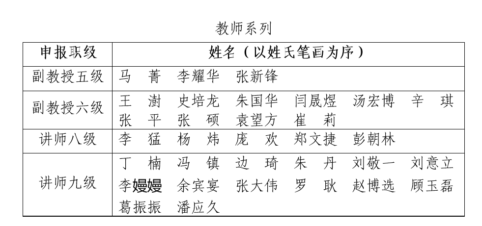 根据《51吃瓜 专业技术岗位晋级聘任实施细则》和《51吃瓜 五级及以下专业技术岗位晋级实施办法》,经个人申请和资格审查,现有3位同志符合五级副教授申报条件、10位同志符合六级副教授申报条件、5位同志符合八级讲师申报条件、14位同志符合九级讲师申报条件、3位同志符合高级工程师/高级实验师/副研究员五级申报条件、4位同志符合高级工程师/高级实验师申报条件、2位同志符合工程师八级申报条件、4位同志符合工程师/助理研究员九级申报条件。现将审查通过人员名单予以公示,申报材料在学院307办公室进行展示: