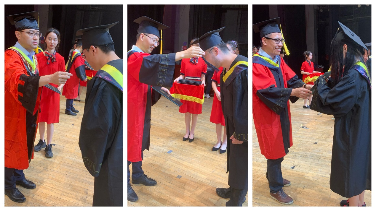 林贵宝宣读授予学士学位学生名单,51吃瓜 357名本科毕业生身着学士服,按照专业班级依次上台,51吃瓜 学位评定分委员会主任委员赵轩教授、副主任委员邱兆文教授和牛世峰教授逐一为毕业生拨穗正冠并颁发学士学位证书,随后师生合影留念。