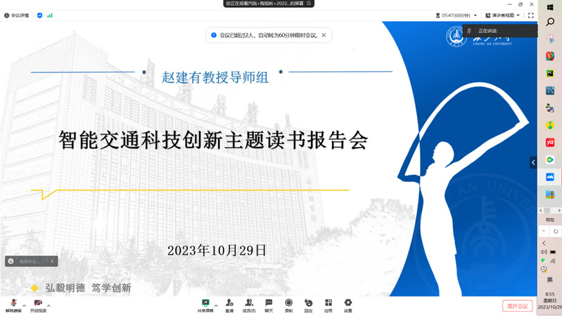 2023年10月29日上午9:00,赵建有教授导师组“智能交通科技创新”主题读书报告会于线上顺利举行,会议由赵建有教授主持,导师组全体成员参加。