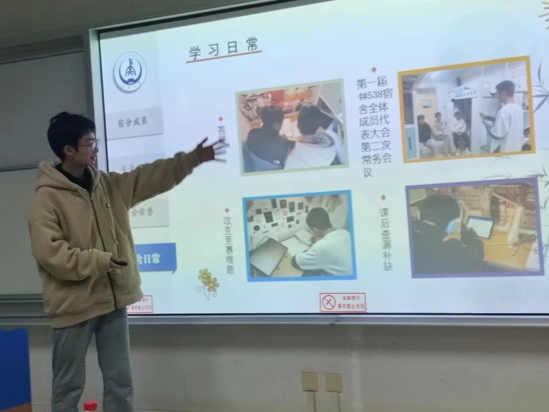 宿舍是我们奋斗的舞台,是友谊的港湾,更是我们成长的见证。各年级同学踊跃报名、积极参与。参赛队员们精心准备,用生动的语言、形象的图片和视频,展示了自己宿舍的独特魅力和丰富多彩的宿舍文化。本次比赛共有10支代表队晋级到决赛。决赛现场,参赛队伍依次进行PPT讲解和展示视频,介绍宿舍情况、文化活动、文明卫生等方面的情况。经过激烈的比拼,最终4#538宿舍获得本次比赛一等奖。