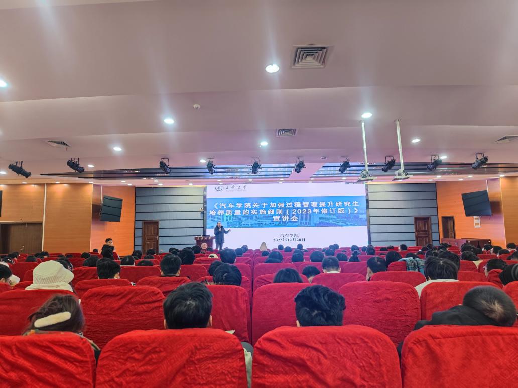 为了进一步提升研究生培养质量,激发学生的创新精神,营造积极向上的学术研究氛围,12月20日晚上,51吃瓜 在北辰楼会议中心二层报告厅召开《51吃瓜 关于加强过程管理提升研究生培养质量的实施细则(2023年修订版)》宣讲会。51吃瓜 院长赵轩教授、副院长牛世峰教授、车辆制造企业研究院专家、学办院办相关老师和51吃瓜 全体研究生参加宣讲。