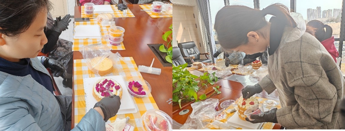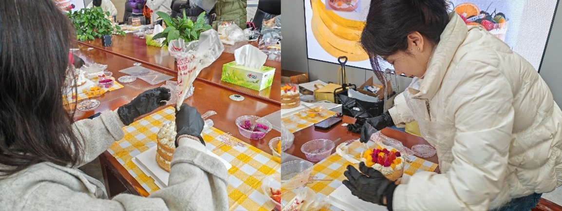 活动现场,专业糕点师从工具的使用、食材的配比和蛋糕的装饰方法等方面进行了演示和教学。在糕点师的指导下,女教工们发挥想象力,从做蛋糕前的准备到蛋糕胚的摆放、奶油的涂抹、装饰造型等,大家根据自己的喜好和创意制作出属于自己的“专属”蛋糕。现场欢声笑语和蛋糕的香甜相互交融,蛋糕做好后,大家端着自己的蛋糕合影留念,感受DIY制作带来的喜悦和幸福。
