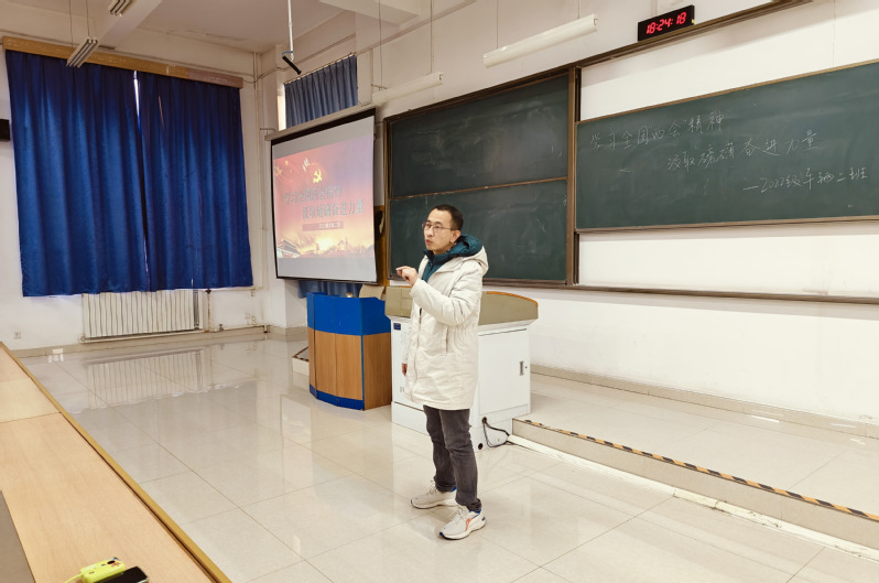 活动中,班级新一批入党积极分子宋滟泽、赵子祥和郑健首先为同学们介绍了两会的基本概念和重要意义,并对本次的两会内容进行了简短的概括。随后,班主任王飞详细解读了两会的主要内容和精神。他强调,今年的两会是在实现“十四五”规划的关键之年召开的,具有特殊的重要意义。两会期间,代表们围绕经济发展、民生改善、民主法治、生态文明建设等多个方面展开了热烈的讨论和深入的交流,为推动我国社会主义现代化建设迈出了坚实的步伐。最后,王老师鼓励同学们要将两会精神内化于心、外化于行,积极投身到国家和社会的发展中去。他希望同学们能够树立正确的世界观、人生观和价值观,以更加饱满的热情和更加坚定的信念,为实现中华民族伟大复兴的中国梦贡献自己的力量。
