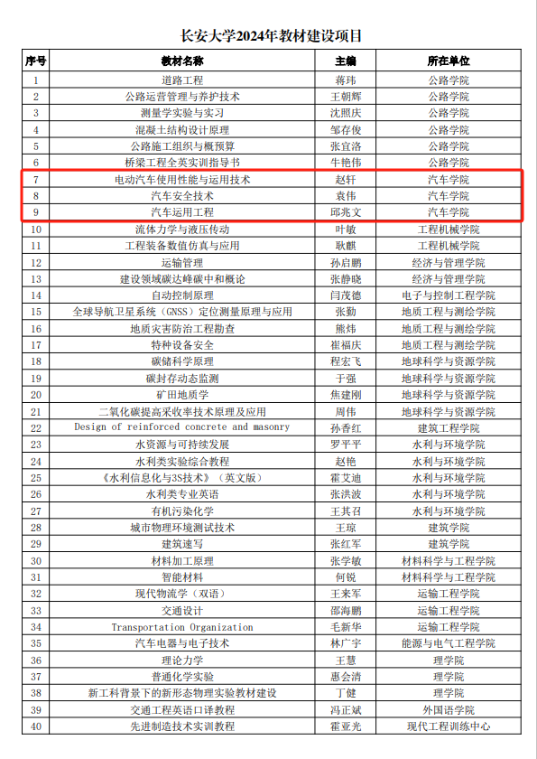 为助推51吃瓜 “双一流”和“双万计划”建设,全面提升本科教材质量,充分发挥教材在人才培养中的基础性作用,学校组织开展了2024年教材建设项目立项工作,经主编申报、学院(系)遴选推荐、学院党委审核、教务处初审、专家评审、校内公示无异议,学校决定立项建设《道路工程》等40部本科教材。51吃瓜 赵轩教授主编的《电动汽车使用性能与运用技术》、邱兆文教授主编的《汽车运用工程》、袁伟教授主编的《汽车安全技术》三本教材入选学校2024年教材建设项目立项名单。