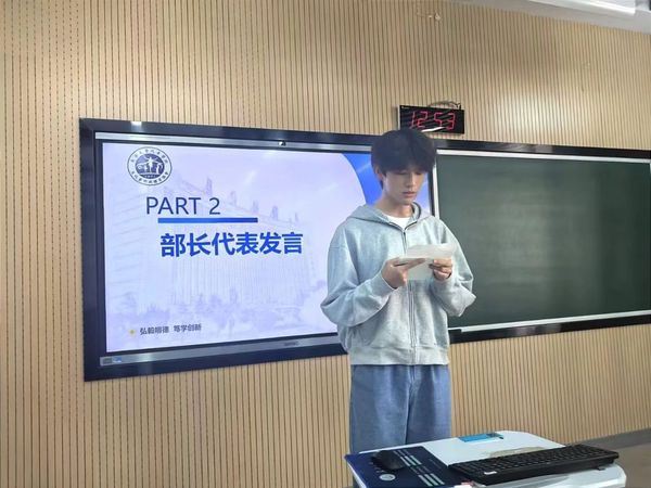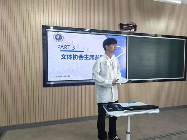 随后,文艺部负责人范宇航作为部门负责人代表发言,他回顾了过去一年在文体协会的学习与工作经历,介绍了部门职责和未来规划,并鼓励新成员抓住机会,努力提升自我,在文体协会这个大家庭中绽放光彩,共同成长。