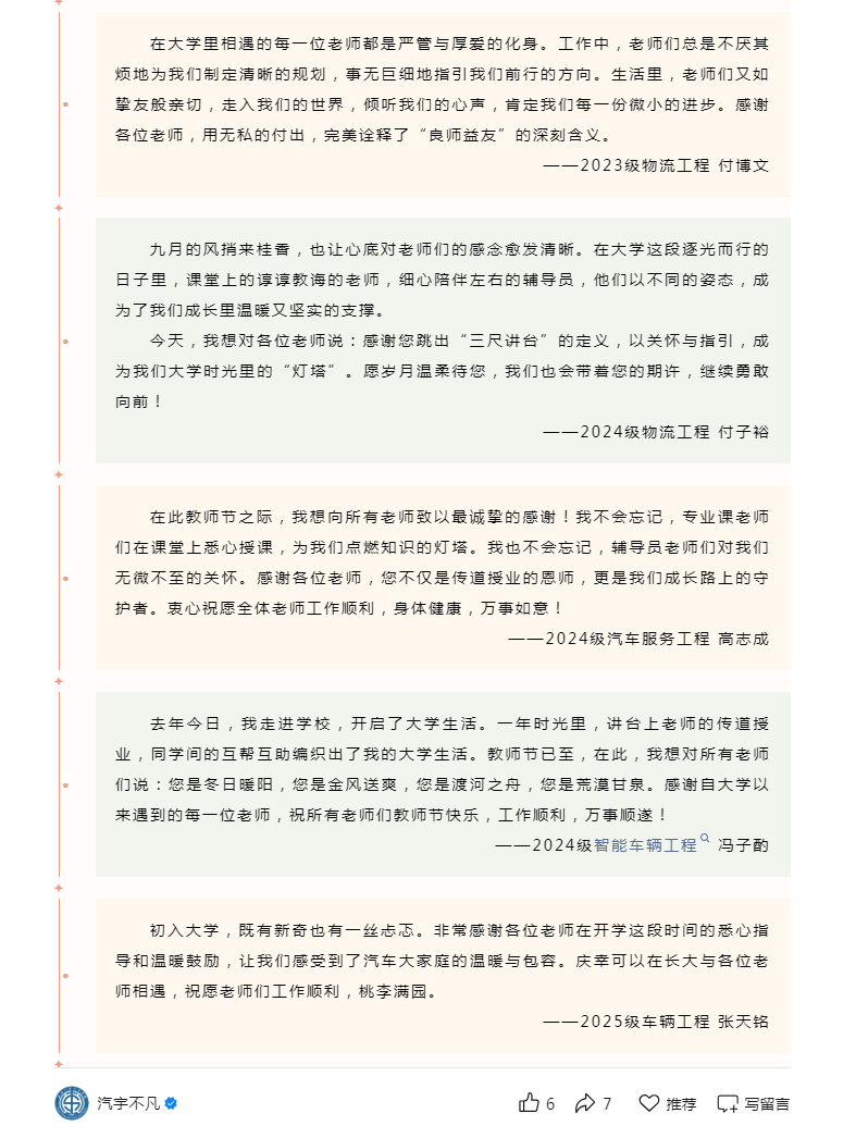 三是营造浓厚氛围,弘扬立德树人“主旋律”。通过横幅标语、橱窗海报、电子屏幕方式等开展庆祝第41个教师节主题宣传活动,全方位展示学院广大教师在教书育人过程中担当作为、爱岗敬业、甘于奉献的感人事迹,加强节日氛围营造。“汽宇不凡”微信公众号面向学生征集“教师节祝福语”,推出《令公桃李满天下,何用堂前更种花》微信专辑,向教师们送上节日祝福。