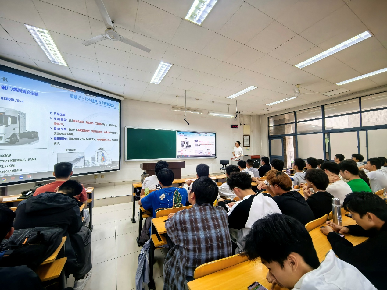 在研讨课上,侯权从市场环境、技术研发与产品方案三大维度,全方位剖析了燃料电池技术的优势与发展前景,为大家勾勒出新能源汽车行业的未来趋势,并将学业规划与职业发展紧密对接,有效拓宽了同学们的专业视野,将课堂理论延伸至工程实践与行业前沿。在互动环节,侯权对同学们关心的专业及行业问题进行了深入浅出的答疑与探讨。此外,侯权还展示了陕汽重卡在新能源汽车领域的先进技术成果,燃料电池产品的最新研发进展,充分彰显了陕汽雄厚的科研实力。